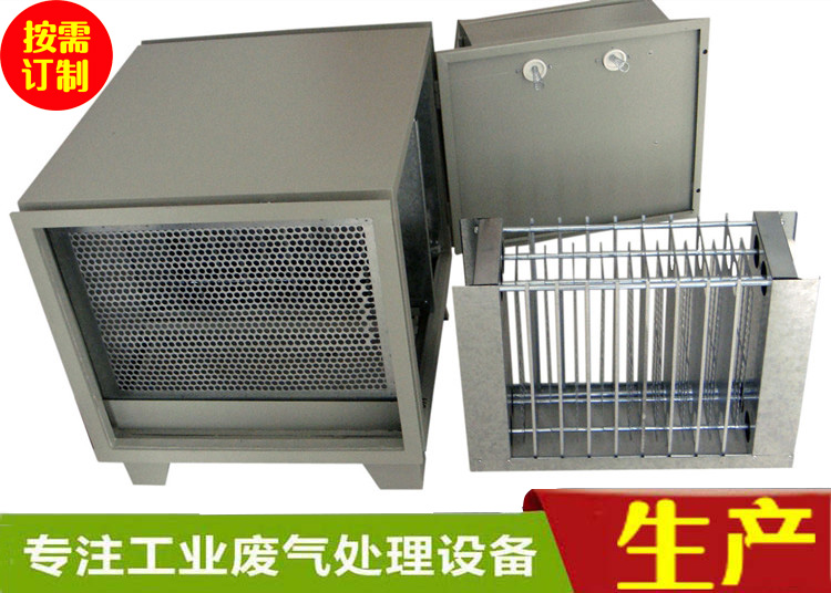 LW系列油煙凈化器為二級(jí)式靜電吸附型,用來(lái)去除細(xì)微粒徑的碳?xì)浠衔锖推渌諝庵械碾s粒。它的二級(jí)式是指電離段與收集段,每個(gè)電離段由一系列鎢鋼線組成,安裝在一系列接地板中間,并通給高壓直流電。大氣中的微粒在通過(guò)電離器的強(qiáng)力靜電場(chǎng)時(shí),被電離并帶有正或負(fù)電荷。